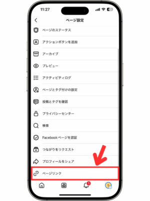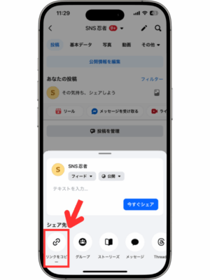 画面を下までスクロールし、「リンクをコピー」をタップすると、ファンページURLを取得できます。