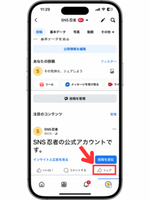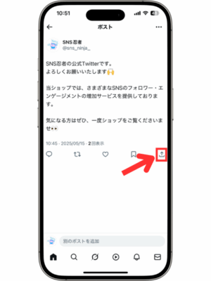 プロフィールページ右上部の「共有マーク」をタップしてください。