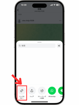 「リンクをコピー」をタップすると、投稿ページ(投稿)のURLを取得できます。