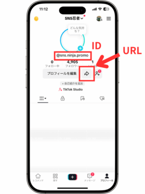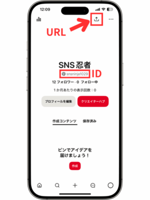 アカウントURLは、プロフィールページの「共有マーク」をタップしてください。