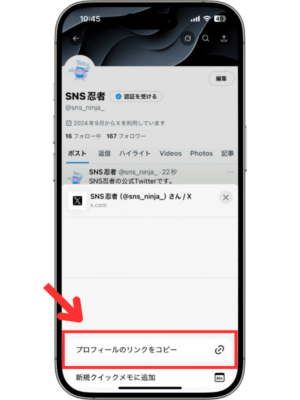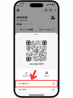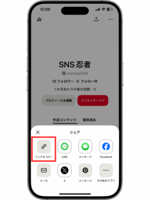 「プロフィールのリンクをコピー」をタップすると、アカウントURLをコピーできます。