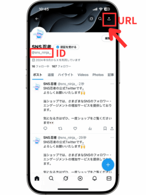 アカウントURLは右上部の「共有マーク」をタップしてください。