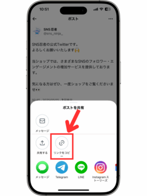 「リンクをコピー」をタップすると、投稿URLをコピーできます。