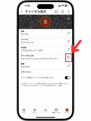 チャンネルURLの項目の「コピーマーク」をタップすると、チャンネルURLをコピーできます。