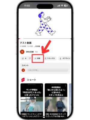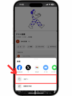 「コピー」をタップすると、動画投稿のURLをコピーできます。
