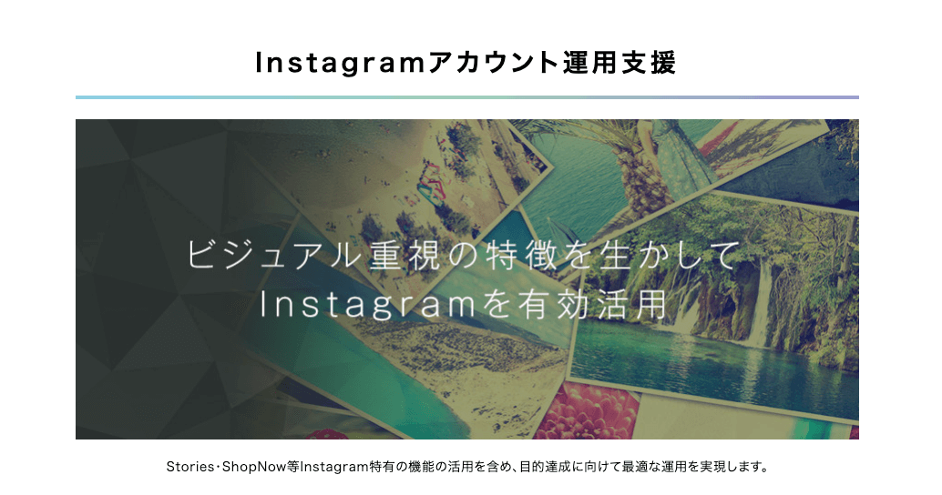また、Instagramを日々研究している専門チームをアサインしてもらうことができ、運用設計からアカウント運用、投稿クリエイティブの企画・制作など、運用の全般をお任せできるため、初めてSNS運用を始める方でも安心です。
