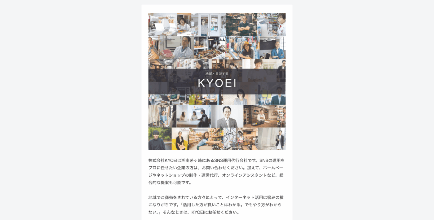 株式会社KYOEIは、地域の企業や商店のInstagram運用のサポートを得意とする会社です。