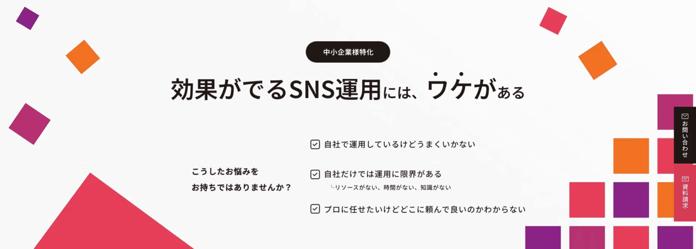 市場動向調査から課題抽出、設計、投稿補助、素材の作成まで、SNSを活用したマーケティング活動に関するすべてをサポートしている点が特徴です。