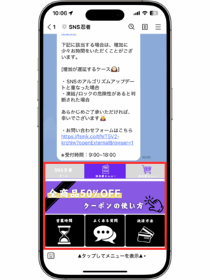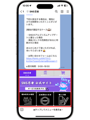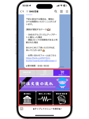 サービスの案内公式LINEの使い方 Posted on 2025年5月15日2026年2月15日 by stuff 15 5月 SNS忍者の公式LINEでは、ご注文前・後のお悩みを簡単に解決できるよう、さまざまな機能を搭載しております。 ※公式LINEでの個別のご質問は承っておりません。ご質問はお問い合わせページからお願いいたします。 目次 1:ホーム2:注文前メニュー3:注文後メニュー1:ホーム ホームでは当ショップの概要を知ることができます。 2:注文前メニュー 注文前メニューでは、ご注文前のお悩みを解決することができます。 3:注文後メニュー 注文後メニューでは、注文後のお悩みを解決することができます。 »ホームに戻る stuff SNS忍者の強み SNSのID・URLを取得する方法