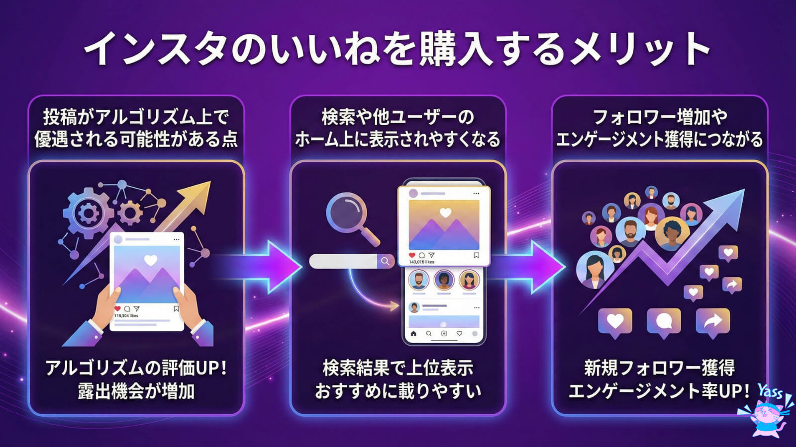 インスタのいいねを購入するメリットは、投稿がアルゴリズム上で優遇される可能性がある点です。