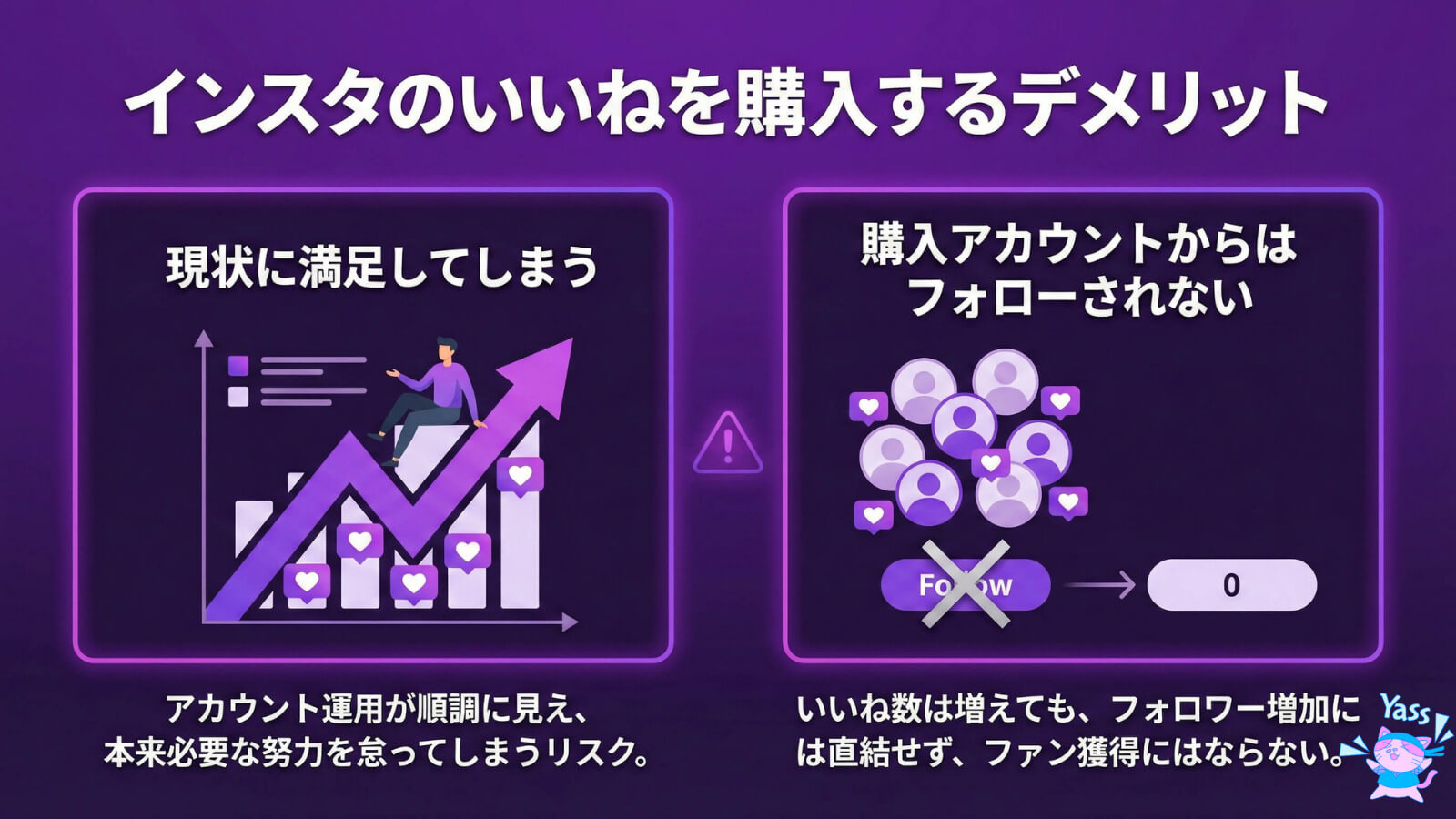 コンテンツの質やユーザーとの関係性を見直さずに「いいね購入」に依存しすぎると、改善意識が薄れ、長期的な成長を妨げてしまう恐れがあります。