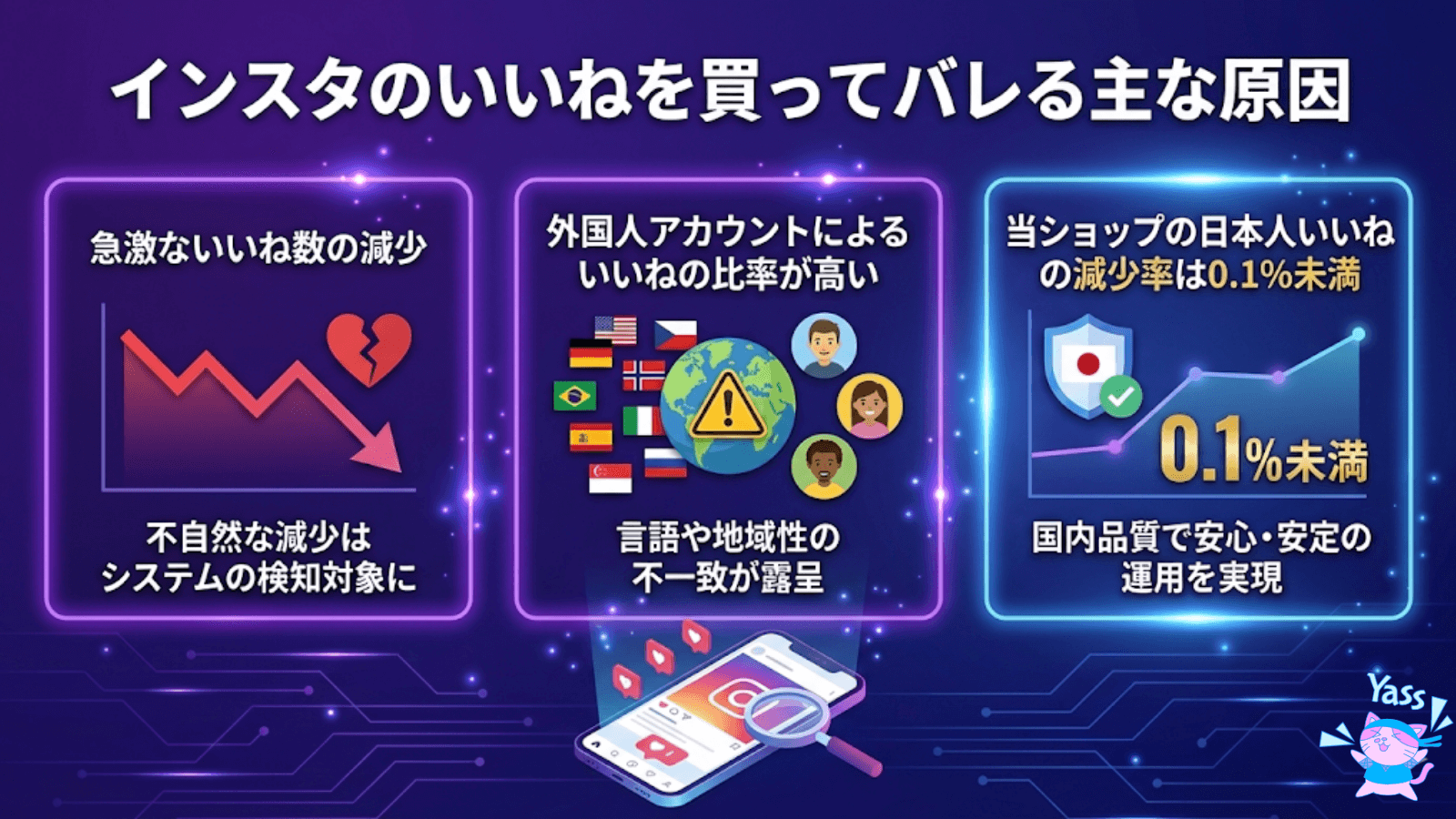 特に「外国人いいね」は、いいね欄を閲覧された際に不自然なアカウントが目立ちやすく、購入を疑われるリスクが高まります。
