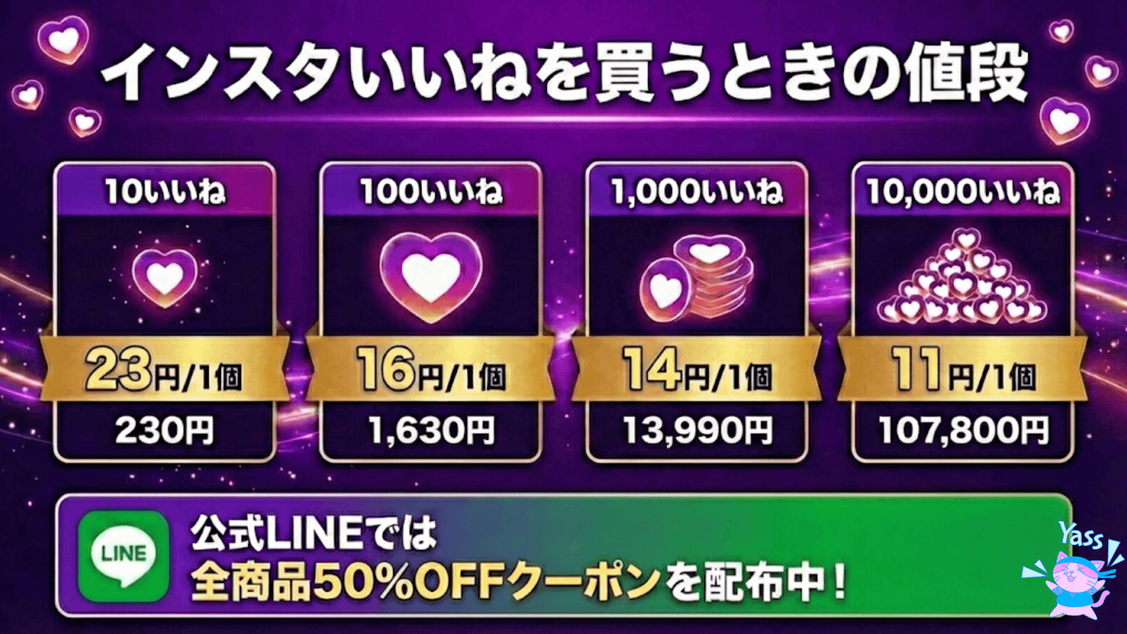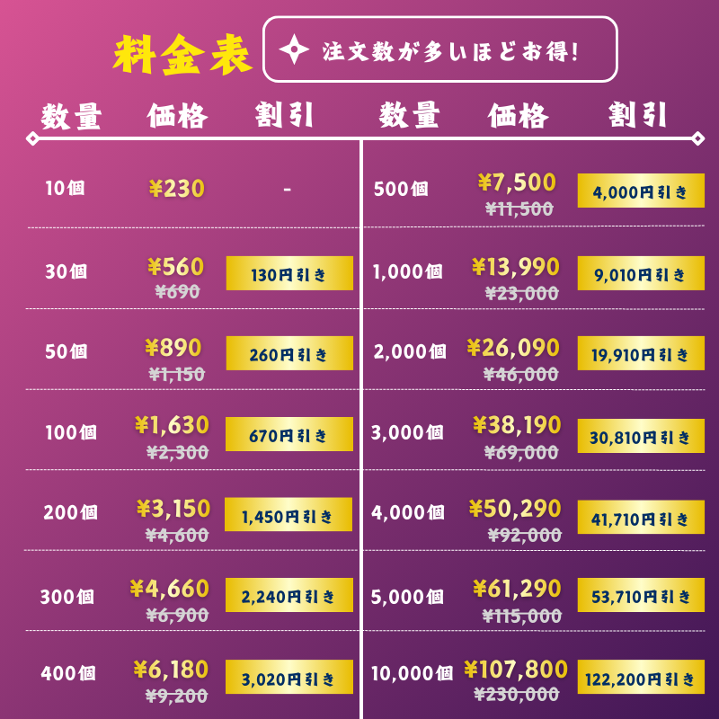 当ショップのインスタ日本人いいねは、1いいねあたり10円〜23円でご購入いただけます。注文数が多くなるほど、以下のようにいいねを割安でお求めいただけます。