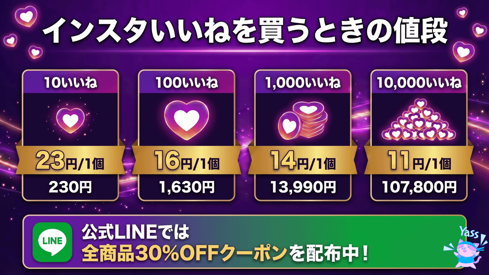 当ショップのインスタ日本人いいねは、1いいねあたり11円〜23円でご購入いただけます。注文数が多くなるほど、以下のようにいいねを割安でお求めいただけます。
