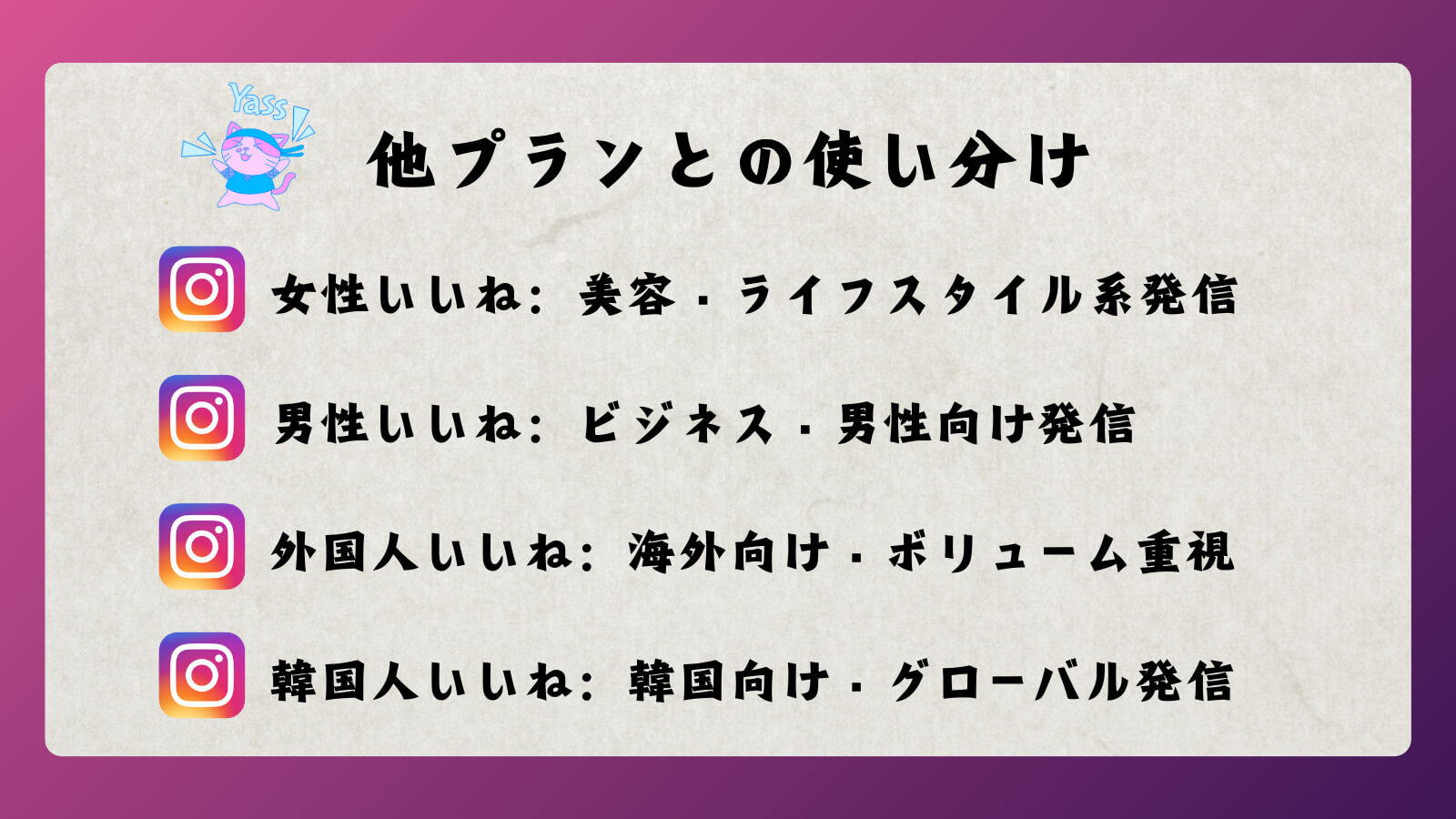 日本人女性いいねは、美容やファッション、日常系の投稿と親和性が高いプランです。