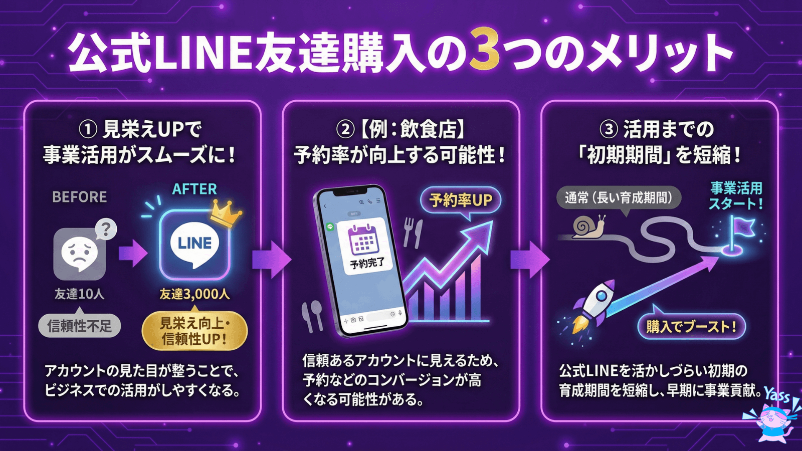公式LINEの友達を購入するメリットは、アカウントの見栄えが良くなることで、公式LINEを事業に活かしやすくなる点です。