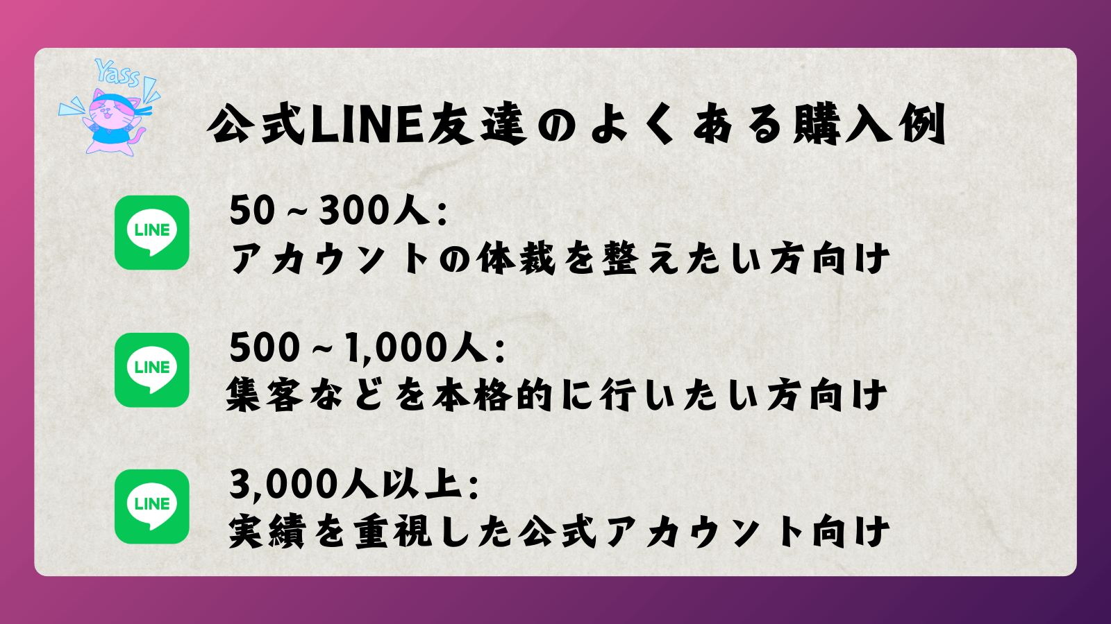 友達数が増えることで、運用されている公式アカウントとして認識されやすくなり、初期段階でアカウントの土台を作りたい場合に向いた購入例です。