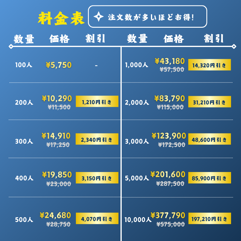 ただ、公式LINEにて全商品を50%OFFでご注文いただけるクーポン※を配布しておりますので、お試し価格でサービスをご利用いただけます。