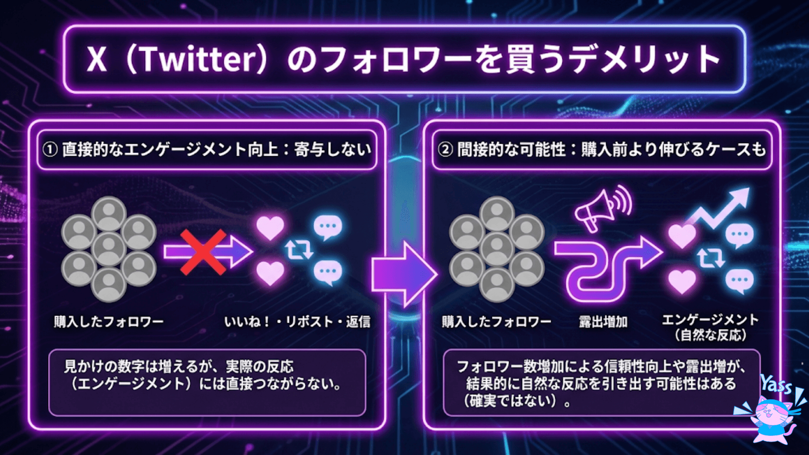 X(Twitter)フォロワーを買うデメリットは、直接的にエンゲージメントの向上に寄与するわけではない点です。