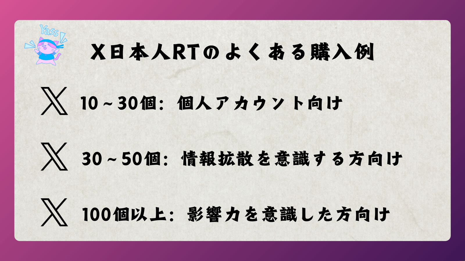 本ページでは、X(Twitter)日本人RT購入を検討している方向けに、提供条件や注意点、購入数の考え方を整理しています。