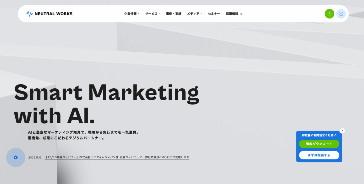 株式会社ニュートラルワークスは、AIと豊富なマーケティング知見を活かし、戦略設計から施策の実施まで一貫して依頼できる会社です。